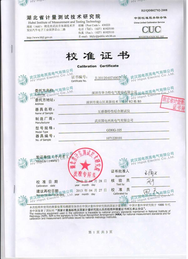 GDHG-105 互感器特性綜合測試儀 檢定證書