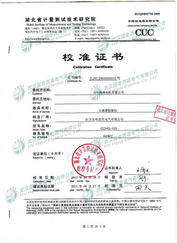 GDHG-105 互感器特性綜合測試儀 檢定證書